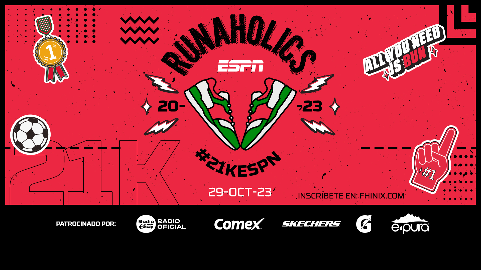 Ciudad de México, 27 de octubre.- El domingo 29 de octubre estará de regreso el medio maratón de ESPN, RUNAHOLICS #21KESPN 2023. La CDMX recibirá a los/las “runaholics” en punto de las 6:30 a. m. Las inscripciones continúan abiertas en Fhinix.com, tiendas Innovasport de todo el país y Metta Running House, y quedan pocos lugares.