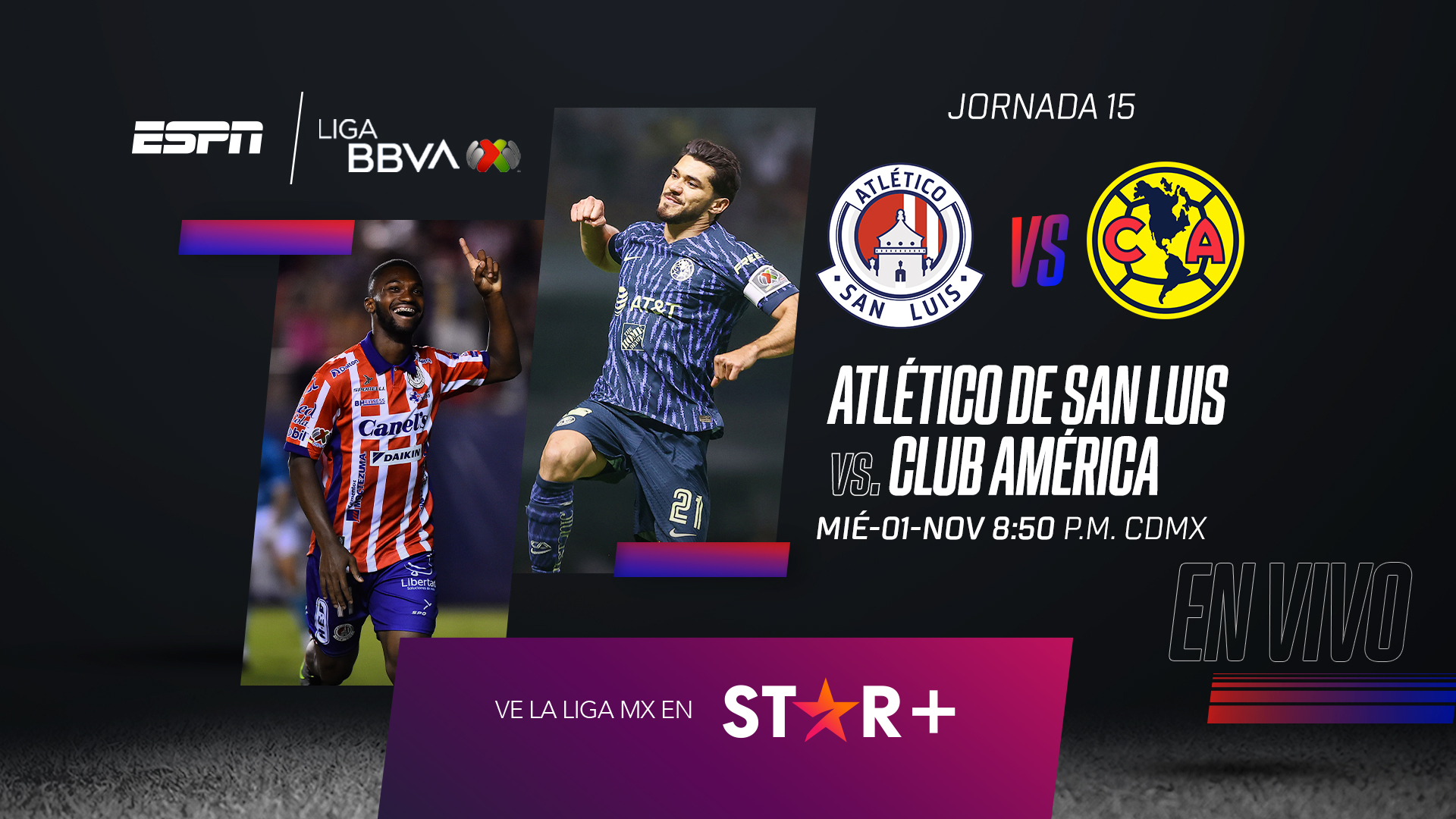 Este miércoles 1 de noviembre, llega de manera exclusiva a ESPN el partido del Atlético de San Luis vs. Club América, donde los Potosinos enfrentan a las Águilas en un encuentro desde el estadio Alfonso Lastras, en el Bajío. El juego estará disponible en VIVO y en EXCLUSIVA por ESPN y para los suscriptores de Star+ en México.