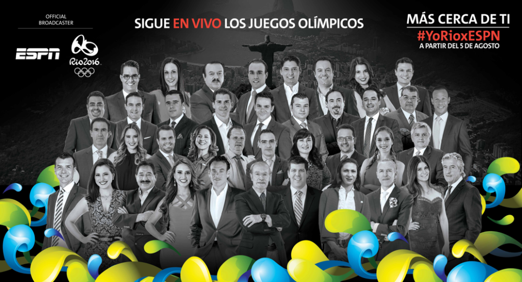 ESPN ofrece una incomparable cobertura en vivo de los Juegos Olímpicos Rio 2016. Más de 1300 horas en vivo, todo en streaming y en alta definición por ESPN, ESPN2, ESPN3, ESPN+ y ESPN Play. ESPN dispondrá de un equipo de 850 personas alrededor del mundo contribuyendo a la cobertura, de los cuales 450 estarán en Rio de Janeiro, entre ellos: especialistas, periodistas y técnicos.