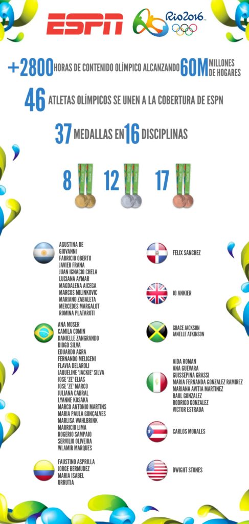 ESPN, emisora oficial de los Juegos Olímpicos Río 2016, contará con la participación de 46 atletas olímpicos durante sus 2,800 horas de cobertura completa y multiplataforma en América Latina y en el Caribe. ESPN transmitirá los Juegos Olímpicos 2016 a más de 60 millones de hogares en la región en inglés, portugués y español.