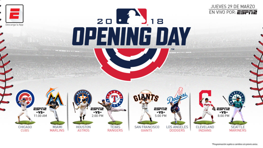 La cobertura del Opening Day arranca el próximo 29 de marzo por ESPN 2, señal que contará con más de 12 horas de programación continua, incluyendo 4 juegos, iniciando con una emisión de “Béisbol Esta Noche” a las 9:30 a.m. (tiempo del centro) y otra emisión a las 4:30 p.m. (tiempo del centro). Los encuentros que se transmitirán en vivo y en exclusiva por ESPN son los siguientes: