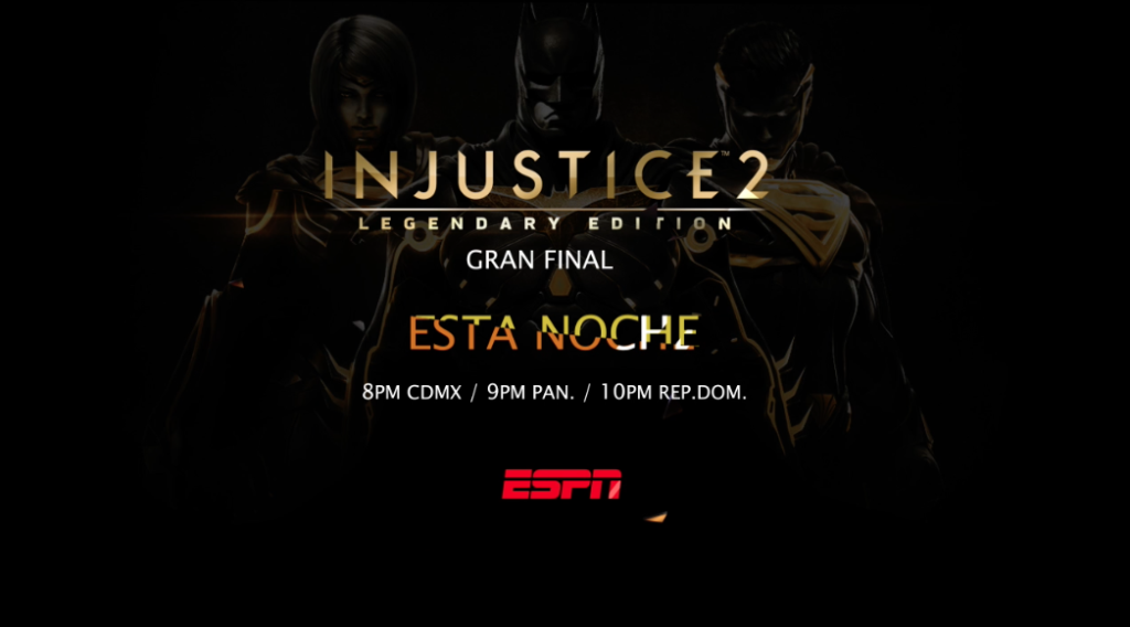 ESPN transmitirá la Final Global Injustice 2 Pro-Series el próximo martes 13 de noviembre a las 08:00 p.m. (hora del centro) por ESPN, desde Chicago. El reconocido comentarista de ESPN, Eitán Benezra, estará a cargo de la transmisión televisiva para México, Centroamérica y Sudamérica.