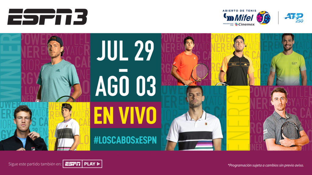 ESPN transmitirá en VIVO y en exclusiva el Abierto de Tenis Mifel presentado por Cinemex, del lunes 29 de julio al sábado 3 de agosto, desde Los Cabos, Baja California Sur, por ESPN3. La actividad en todas las canchas estará disponible vía streaming por ESPN Play. La gran Final podrá seguirse el sábado 3 de agosto a las 9:45 p.m. (hora del centro de México) en vivo por ESPN3 y vía streaming por ESPN Play.