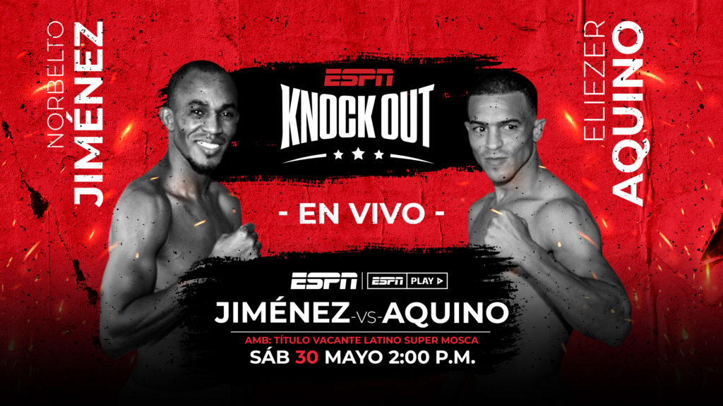 Este sábado 30 de mayo, ESPN KNOCKOUT llevará nuevamente boxeo en vivo a toda Latinoamérica, cuando suene la campana en el Coliseo Carlos ‘Teo’ Cruz de Santo Domingo, en un festival de golpes que resultará histórico. Con dos títulos regionales en juego, subirán al ring Nolberto Jiménez ante Eliezer Aquino y Juan Carlos Cordonés frente a Luis David Salazar. La transmisión estará a cargo del reconocido equipo integrado por Renato Bermúdez, Claudia Trejos, Salvador Rodríguez, Andrés Bermúdez y el juez internacional del CMB, Fernando Barbosa.