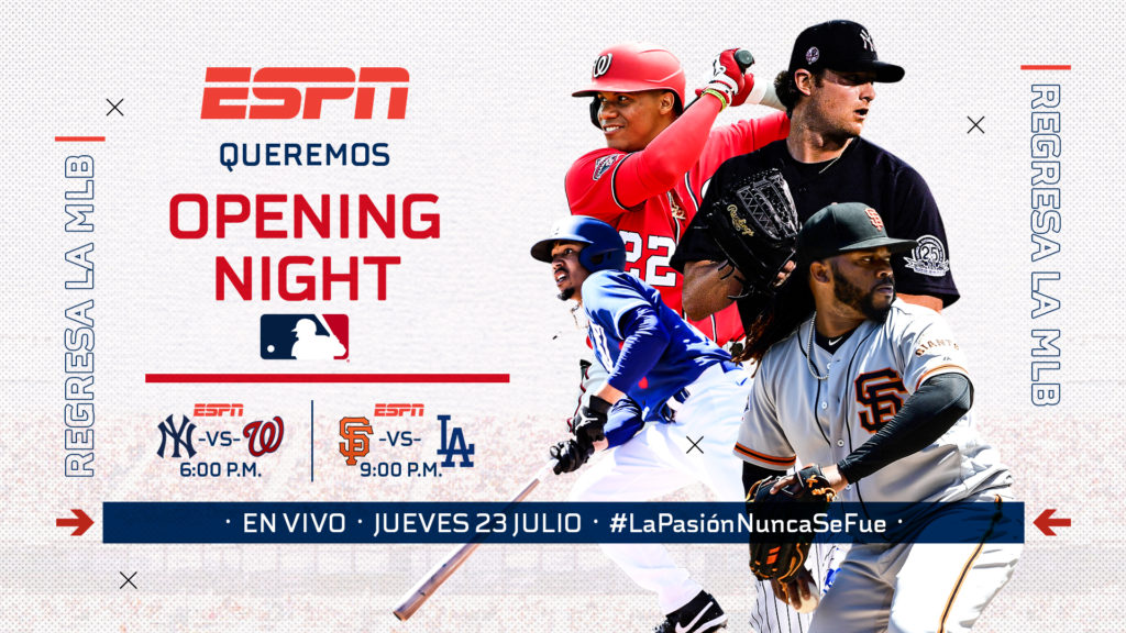Las transmisiones de la temporada 2020 arrancan con la Opening Night, este jueves 23, seguida del Opening Day, el viernes 24 de julio, por ESPN, señal que contará con 15 horas de programación continúa distribuidas en ambos días.