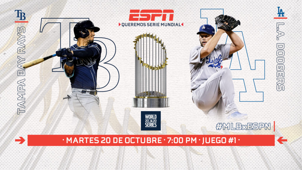 La cobertura comienza con el primer juego entre Tampa Bay Rays vs. Los Angeles Dodgers, desde el Globe Life Field, en Arlington, Texas, el martes 20 de octubre a las 7 p.m. (hora del Centro) por ESPN.