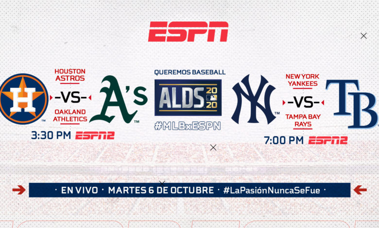 - ESPN transmitirá en VIVO los juegos de la Liga Americana de la Serie Divisional 2020 de la MLB, que se jugarán del 5 al 9 de octubre.