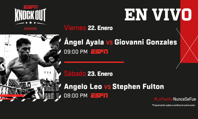 Dos intensas jornadas esperadas por los fanáticos del deporte de los puños de toda Latinoamérica a través de la señal de ESPN KNCOKOUT, que podrán disfrutar de una doble cartelera con acciones este viernes y sábado, con campeonatos mundiales en juego, destacando el encontronazo entre los invictos Angelo Leo y Stephen Fulton por la corona de peso Supergallo de la Organización Mundial de Boxeo.