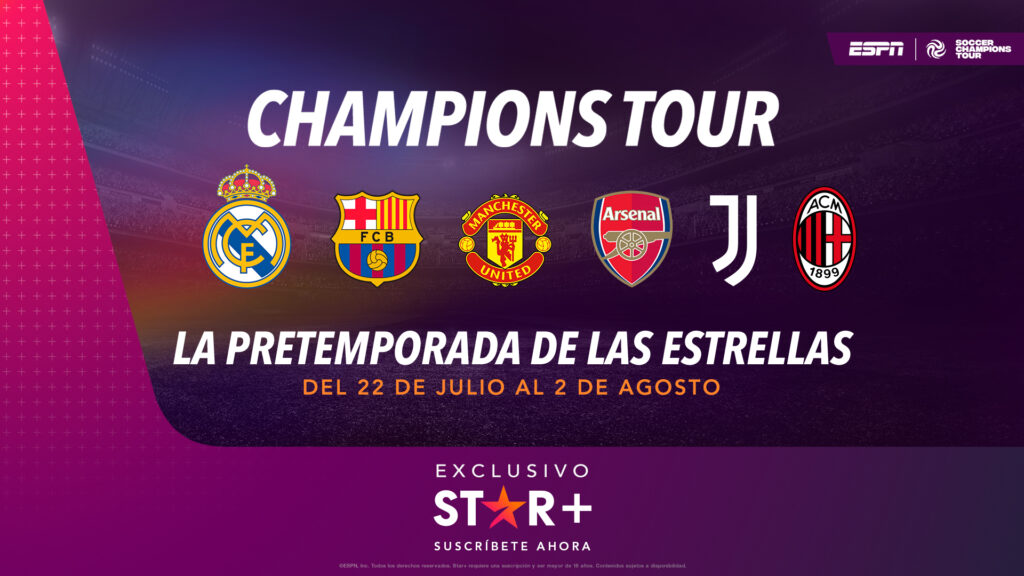 Este mes regresará el mejor fútbol de Europa en EXCLUSIVA a Star+, con el desarrollo del Champions Tour en estadios de los Estados Unidos, como parte de la pretemporada con miras a las Ligas del Viejo Continente y las competencias de la UEFA.En este Champions Tour participarán seis de los equipos más relevantes en el mundo del fútbol: Real Madrid, Barcelona, Juventus, Milan, Arsenal y Manchester United. Este torneo, seguramente, será de enorme utilidad para ajustar detalles en los equipos y ensamblar de la mejor manera los valiosos refuerzos que han llegado. Serán ocho partidos, que se disputarán entre el 22 de julio y el 2 de agosto, con el derby español por excelencia entre Real Madrid y Barcelona y el gran choque entre Juventus y Milan. Además, se jugarán amistosos internacionales, con otros importantes equipos europeos como protagonistas. |
