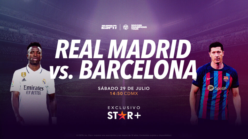 Dos de los equipos más populares de Europa y el mundo se enfrentarán en un emociónate duelo del Soccer Champions Tour, desde Arlington, Texas, como parte de la pretemporada con miras a las Ligas del Viejo Continente y las competencias de la UEFA. Este sábado 29 de julio, el encuentro entre el Real Madrid vs. Barcelona estará disponible en VIVO y en EXCLUSIVA para los suscriptores de Star+ en México.